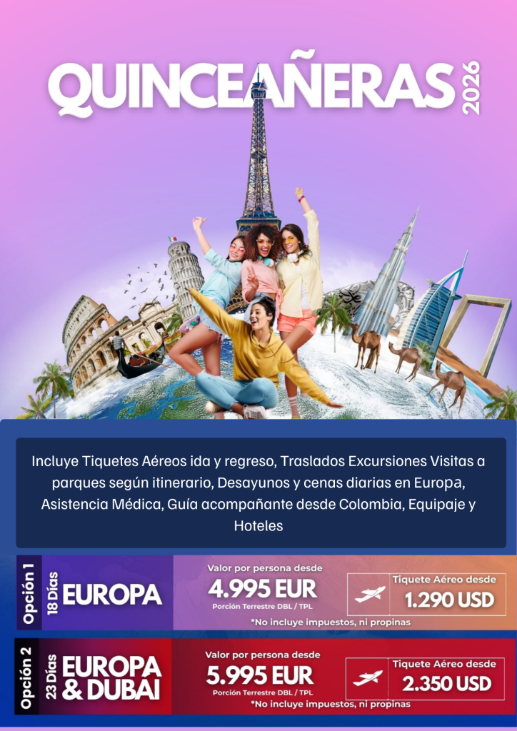 Vive una experiencia inolvidable recorriendo los destinos más icónicos del mundo. Este programa exclusivo para Quinceañeras combina diversión, cultura y aventura en un recorrido lleno de magia. Incluye tiquetes aéreos ida y regreso, traslados, excursiones guiadas, visitas a los principales atractivos y parques según itinerario, además de desayunos y cenas diarias en Europa. Disfruta la seguridad de viajar con guía acompañante desde Colombia, asistencia médica, excelentes alojamientos y actividades diseñadas para crear recuerdos únicos. Elige entre nuestras opciones de Europa o Europa & Dubái y celebra tus 15 como siempre lo soñaste.